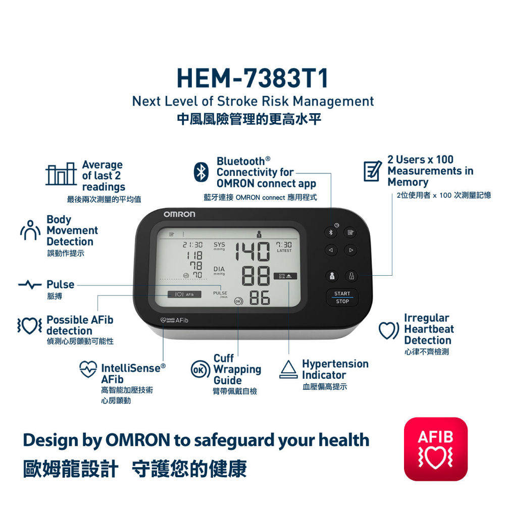 • With just one press, it can simultaneously measure the blood pressure and the possibility of atrial fibrillation (AFib).